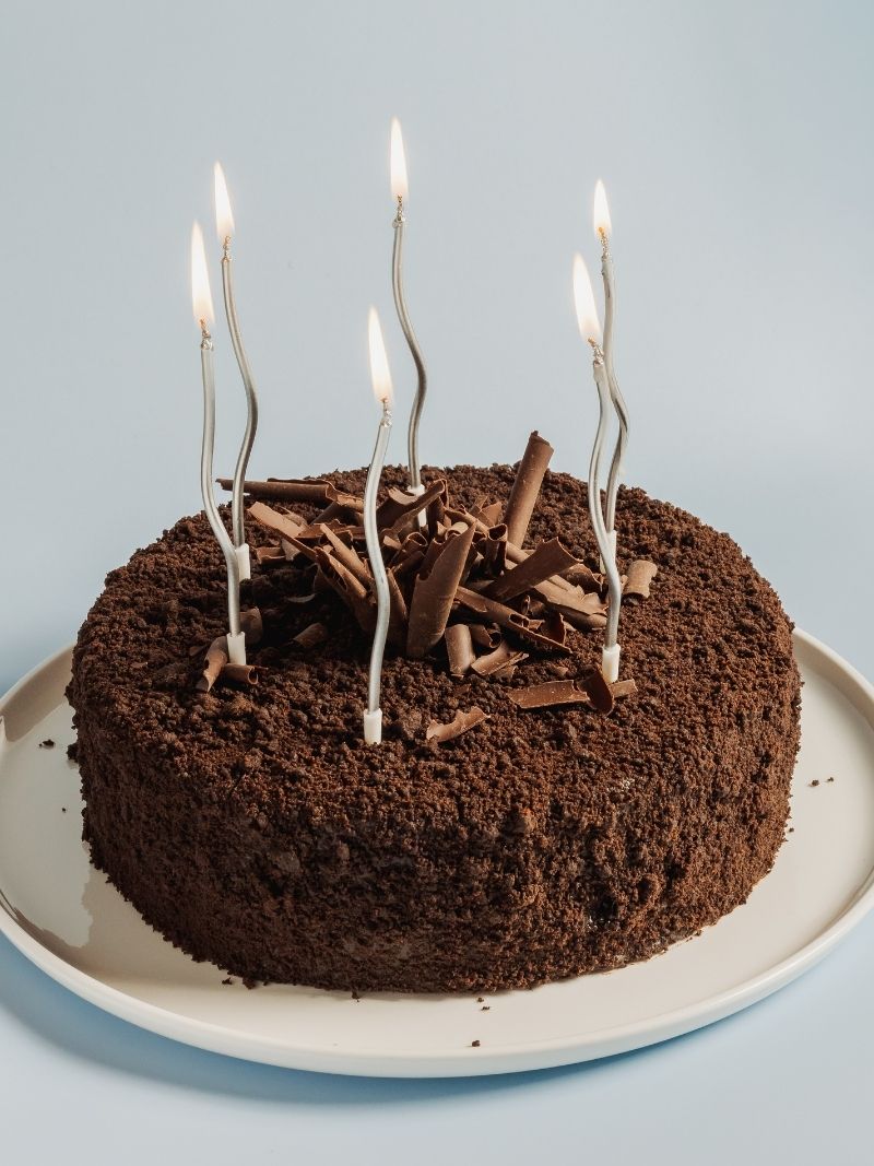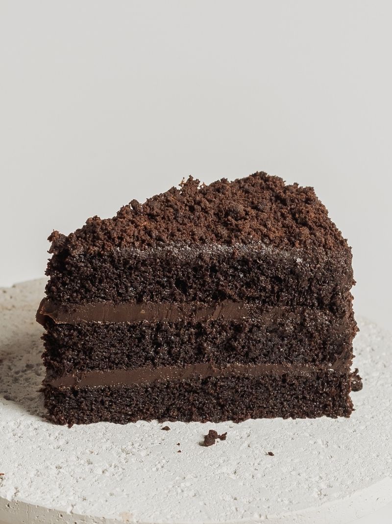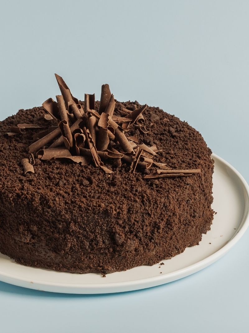 Moist, rich chocolate sponge made with intense 70% dark chocolate, layered with velvety chocolate pastry cream, and smothered in a decadent ganache. Coated in crunchy chocolate crumbs for the perfect textural contrast.